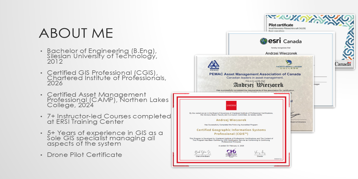 Andrzej is a dedicated GIS professional with a Bachelor of Engineering from Silesian University of Technology, Certified GIS Professional from Chartered Institute of Professional and a PEMAC Certified Asset Management Professional. With over five years of experience at RM of Stanley, Andrzej has been responsible for full-cycle GIS operations, including web mapping, database management, and organizational process improvements.